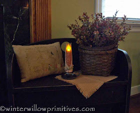 This table is in our foyer...the tin lamp is the Charleston Lamp I sell but it is currently out of stock. Just below the lamp is a sweet little redware square with a pumpkin on it, it is available in my shoppe as well.