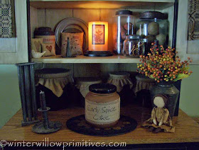 This next picture is of the display I have on top of a cabinet that hubs made a few years ago, I call it my Folk Art Cabinet. I've got the Artificial Fall Boxwood that is sold in my shoppe in a lovely white basket made by Pam (Primitive Basketcase), the doll is one of my all time faves, it was made by Lori (Homespun Prims By Lori), and the other things are just some of my favorite antiques picked up here and there over the years.