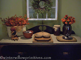 Lastly, this is the olde wash stand table that sits to the left of the fireplace. I've got one of the Artificial Fall Boxwoods in the pitcher and in the bowl I've got some of the Dried Pumpkin Chunks that are available in my shoppe.