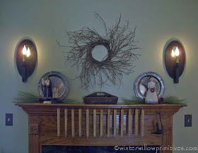 Just to the left of the fireplace sits an olde wash stand, it's one of my favorite areas to decorate. This year I've placed some primitive handmade gingers and candy canes that I've collected over the years. The pine candle wreaths and striped taper candles are sold in my shoppe!