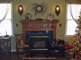 On the right side of the fireplace hearth sits this little boot bench that hubs made a few years ago...the hooked mat was made by Stephanie of Olde Colony Primitives, the wired holly by Norma Schneeman, the wee red box by Barb Kaufman, and the green Belsnickle Santa can be found in my shoppe!