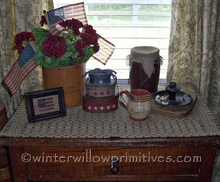 Here we have a patriotic display that includes faux geraniums, tea stained flags, and the little redware pitcher which are all available in my shoppe!